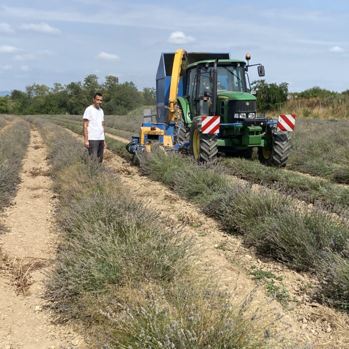 Le moment de la récolte est crucial. Pour garantir la qualité de notre essence, nous utilisons une tête d’ensileuse spécifiquement adaptée. Cette technique moderne permet une coupe nette et rapide des sommités fleuries, évitant ainsi l’oxydation de la plante et préservant l’intégralité des glandes odoriférantes.